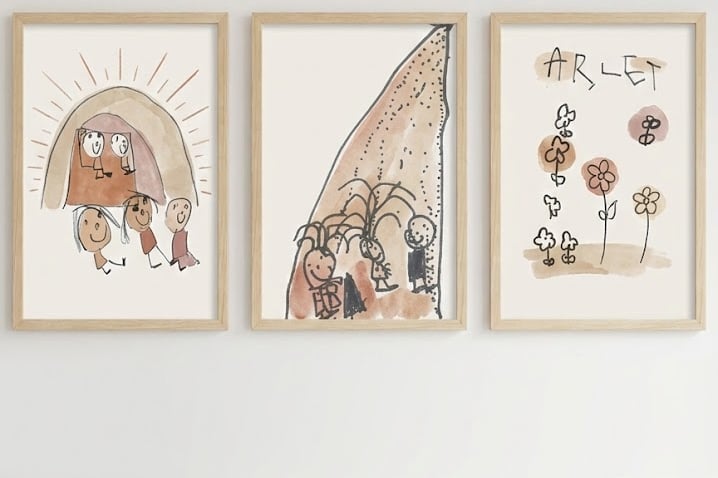 Para este servicio será clave que ese papel tan especial sea escaneado o bien una foto sin sombras, con enfoque correcto, y enviar el fichero para poder trabajar con él. A diferencia de otras webs, preparamos el fichero para que no quede la imagen como una enganxina pegada en la camiseta, eliminamos el fondo si hace falta que se integre bien el diseño en el producto (tèxtil por ejemplo), lo ponemos en el formato adecuado en función de la impresión, se puede crear un producto de diseño moderno (por ejemplo un cuadro decorativo que encaje en tu espacio de casa) combinando con el dibujo del menor.