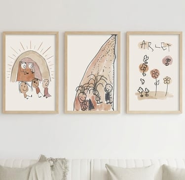 Sabes cuando llega ese hijo, sobrina, vecinito, la hija de tu amiga... y te trae ese super regalo: esa hoja que ha pintado para ti, que ha hecho en el colegio con sus amigos y te mira con cara de orgullo :)... y no sabes qué hacer con ese papel tan especial? (a veces un poco arrugado, o incluso con manchas de merienda...) Pues ha llegado el momento de darle el valor y espacio que se merece! Vamos a convertir estos dibujos en creaciones de arte en mayuscula